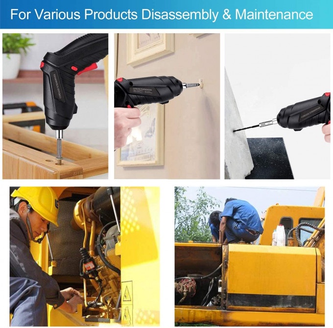 مصباح LED الأمامي جيد للبيئات المظلمة أو الزوايا المظلمة. يمكن استخدام مفك البراغي الكهربائي في حالات مثل انقطاع التيار الكهربائي أو أضواء الطوارئ. تأتي مع 47 قطعة لقمة وعمود مثقاب مرن مناسب لتعليق الصور وتعديلها، وتجميع الأثاث، وإصلاح الألعاب وإصلاح الأجهزة الكهربائية.