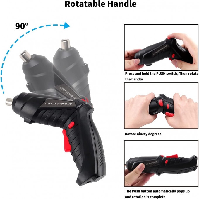 مفك براغي كهربائي لاسلكي مناسب للاستخدام في المنزل والمكتب ومريح للتنفيذ بحجم صغير. يمكن تعديل المقبض في وضعين. 90 درجة كمقبض مسدس بينما 180 درجة كمفك براغي مستقيم ومناسب للاستخدام في الأماكن الضيقة. المقبض المريح يناسب يدك ويجعل عملك أسهل وأكثر أمانًا.